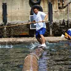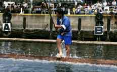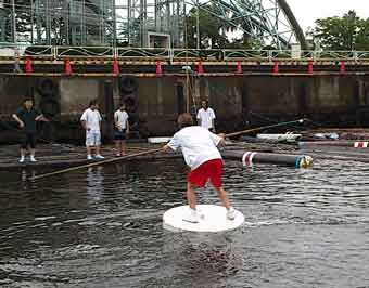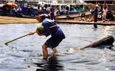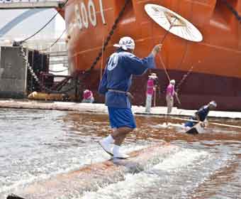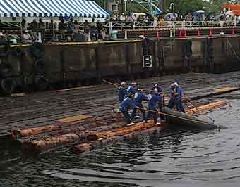 名古屋みなと祭の恒例行事のひとつとして毎年7月に、「名古屋港筏師一本乗り大会」が名古屋港ガーデンふ頭の岸壁前で行われます。
