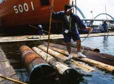 木材輸入港として発展した名古屋港では全盛期には600人を超える筏師がいました。その技術向上と労働災害防止の観点から存続してきたこの大会は2014年で第54回を数えました。
